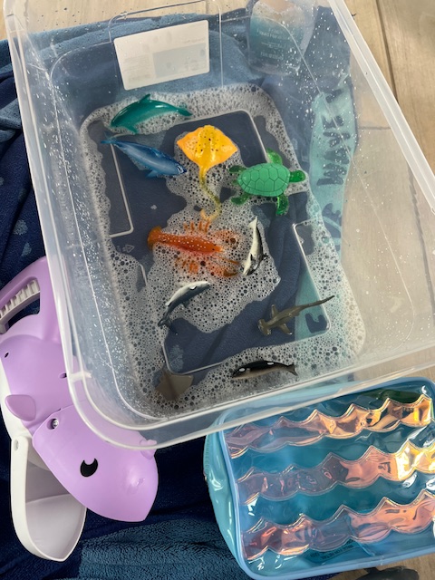 - Washing dishes-Using a clear bin we wash plastic dishes and pretend fruits and veggies. You just need water, soap and I cut a sponge in two, plus a towel. They love getting to pump the soap in, squeeze the sponge to make more bubbles and wash the dishes again after I’ve dried them:)